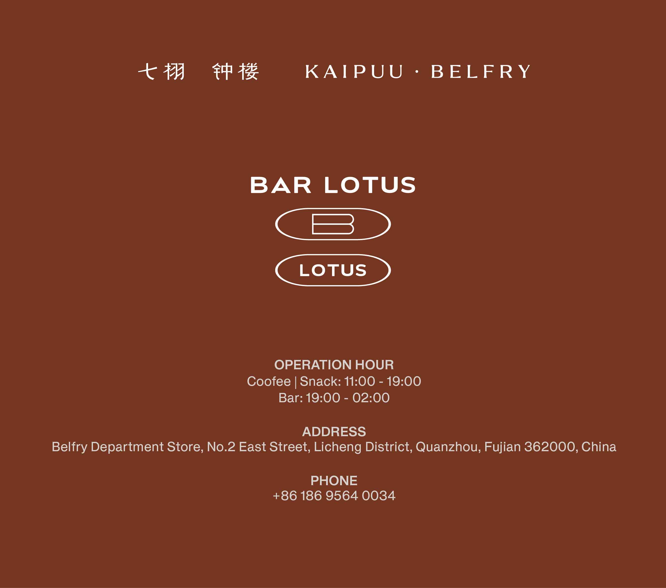 BAR LOTUS has recently set foot in Quanzhou, Fujian, dedicated to the transformation of historical buildings or heading to Kaipuu Hotel, a desirable new destination. In this ancient city full of humanistic heritage and intangible cultural heritage, BAR LOTUS and Kaipuu Hotel are jointly creating a modern casual space with humanistic roots, dancing with the original, and embedding traditional elements. BAR LOTUS breathes in the light and shadow under the clock tower, blending with the ancient and modern of Quanzhou, following the reflection of the sun's glory under the clock tower, integrating into the modern rhythm of the ancient city, and colliding with more aesthetic possibilities.